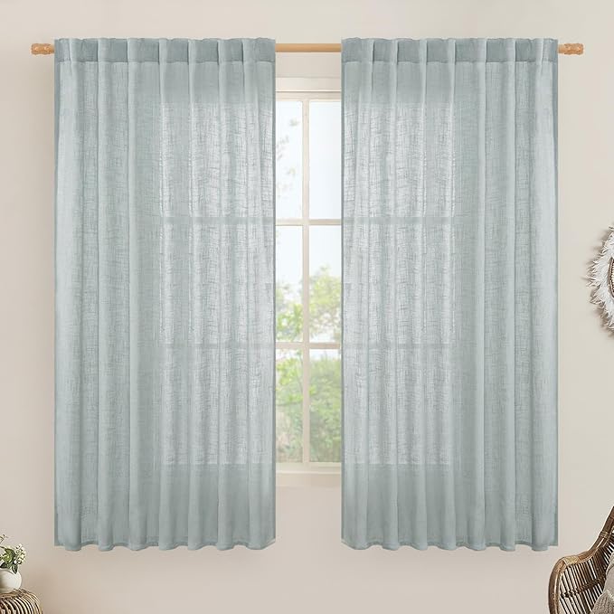 - Package Includes: Include 2 Greyish Blue Linen linen curtains, each light filtering burlap neutral curtain measures 60" W x 63" L (120" wide total). With 8 back tabs and 3” rod pocket fits most standard rods and makes the maximum coverage of windows.