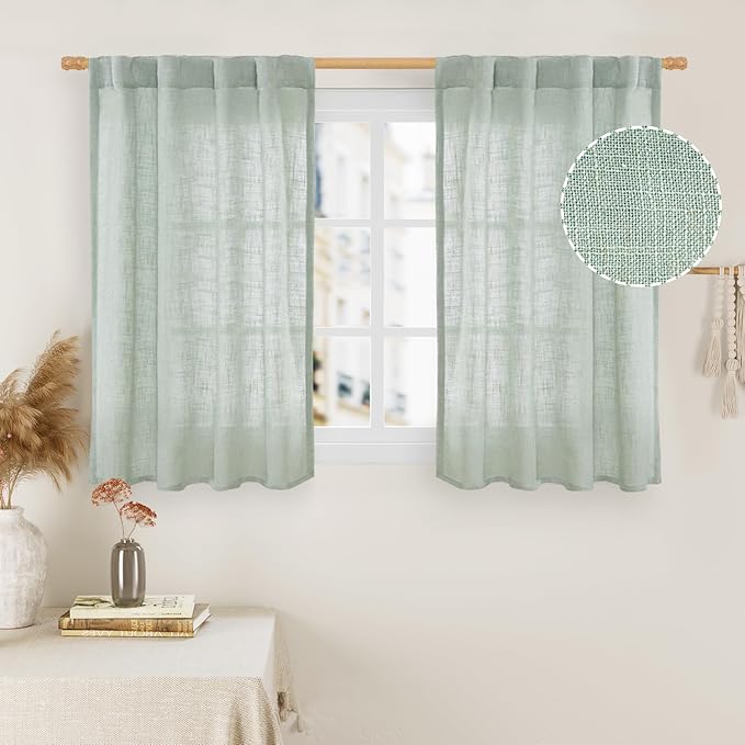 LAMIT Short Linen Window Curtains 40 Inch Length 2 Panels, Light Sage Semi Sheer Light Filtering Panels Back Tab and Rod Pocket Neutral Drapes for Basement/Window/Loft Room, 34 x 40 Inch