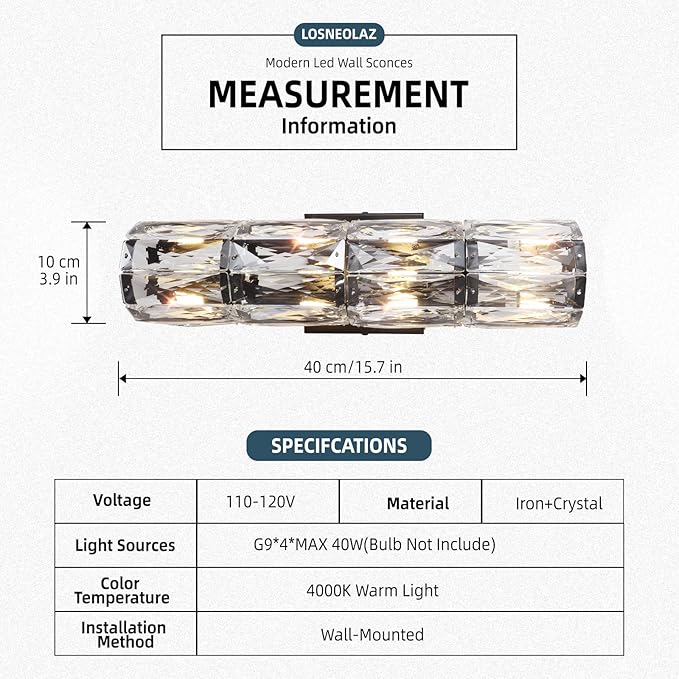 - [High Quality Crystal and Metal] This LED sconces wall lighting indoor comes with unique design. Sprayed metal with anti-rust and precision cuts. Clear crystal attached to the finished metal frame. Beautiful design adding a grandeur and fine texture to your space.