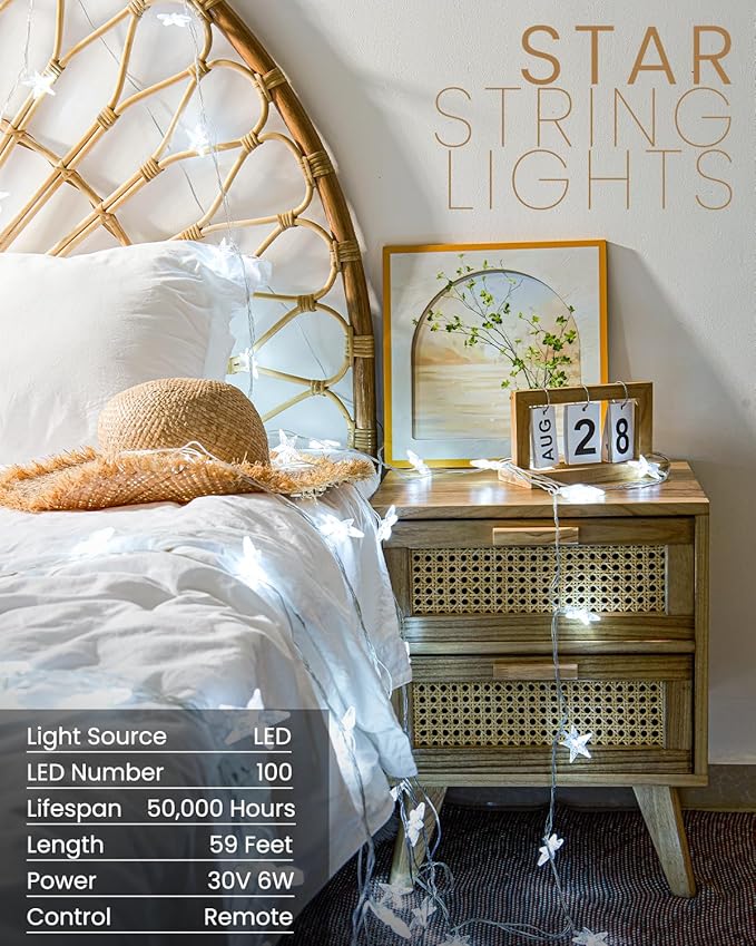 - ✨Rich Function & Effortless Control – Star fairy lights with 8 lighting display including combination, waves, sequential, slo-glo, chasing, slow fade, twinkle, and steady on to suit your mood. Come with a 13-key remote that integrates a timer and dimmer. You can set 6 hours on and 18 hours off or adjust the brightness to 25%/50%/75%/100% using the remote. Twinkle lights will memorize your last setting even if unplug the power.