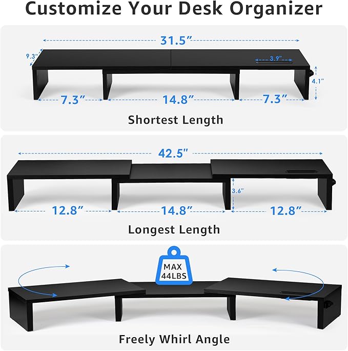 Dual Monitor Stand Riser for 2 Monitors, Monitor Stand for Desk, Adjustable Length & Swivel Angle Wooden Desktop Organizer Stand Riser with Smartphone Holder for PC Monitor Laptop, Black