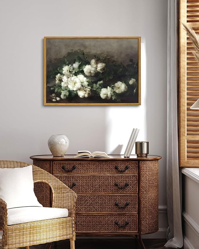 - Floral Oil Painting Cottagecore Home Decor:Perfect for a variety of settings, this framed floral canvas wall art enhances the ambiance of your bedroom, bathroom, or living room. The vintage white floral design and rustic farmhouse aesthetic create a serene and welcoming atmosphere, effortlessly complementing both contemporary and traditional decor styles.