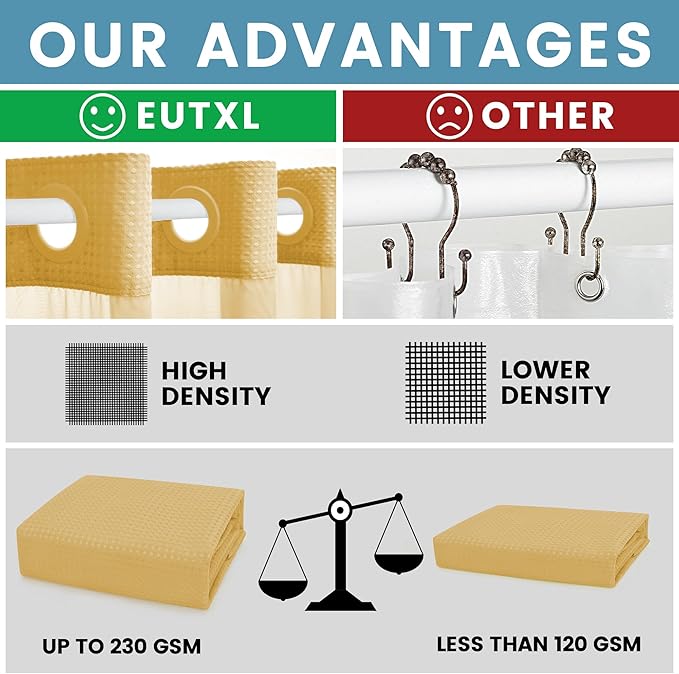 - 【Thick "Cotton" Type Fabric Shower Curtain】Made from expertly chosen and tested Heavyweight Polyester Fabric, touches like a cotton feel. 230GSM (Gram Per Square Meter), about 0.8 pounds heavier than normal 90GSM fabric shower curtains; Honeycomb waffle weave pattern adds elegance to your bathroom