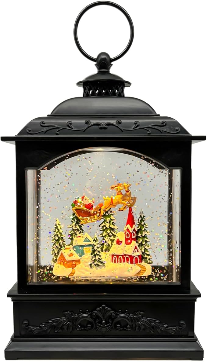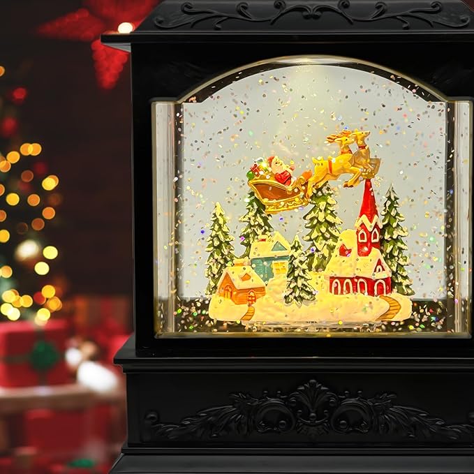 - Exclusive Holiday Design: Our Lighted Water Snow Globe Lantern is a unique Christmas decor crafted from durable plastic, featuring a charming scene of a reindeer pulling Santa Claus through the night sky, delivering presents to children on Christmas Eve. This enchanting design is complemented by continuous swirling glitter, making it a standout piece for your holiday decorations.