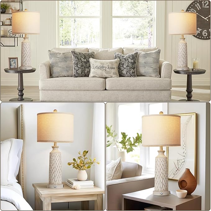 - 【Rustic large table lamps】: The column lampstands of the living room lamps are coated with a layer of beige white finish with a decorative vertical pattern, elegant and beautiful. Up top are straight cylinder white fabric shades that match 2700K warm light creating a cozy and clean finish. The light color tones and elegant lamp body complete the look and make the lamps for living room attract the eyes' attention and are suitable for a bedroom, living room, foyer and more space