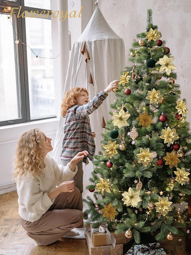 - FABULOUS AND DELICATE CHRISTMAS FLOWERS: Floweroyal Christmas poinsettia flowers are made of silk and plastic. Using advanced dyeing techniques, 6 popular colors for you to choose, not easy to fade. The charming little glitter adorns the flowers, beautiful and stylish