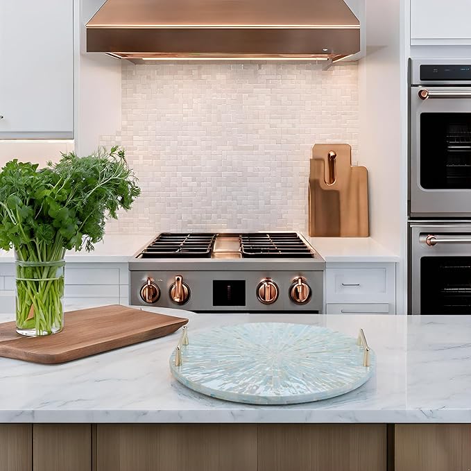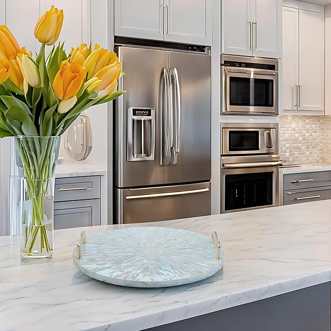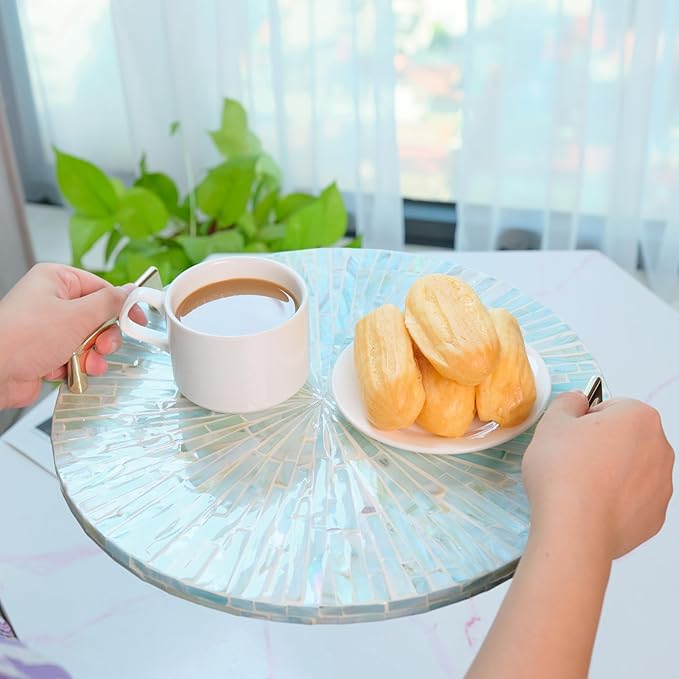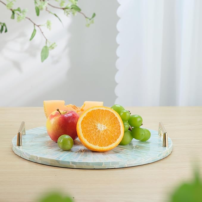 PEMAR Mother of Pearl Decorative Tray, 13" Round Display and Serving Tray with Gold Handles, Vanity/Perfume/Trinket Catchall for Dresser, Bathroom, Vanity Table (Teal Sunlight Starburst Pattern)