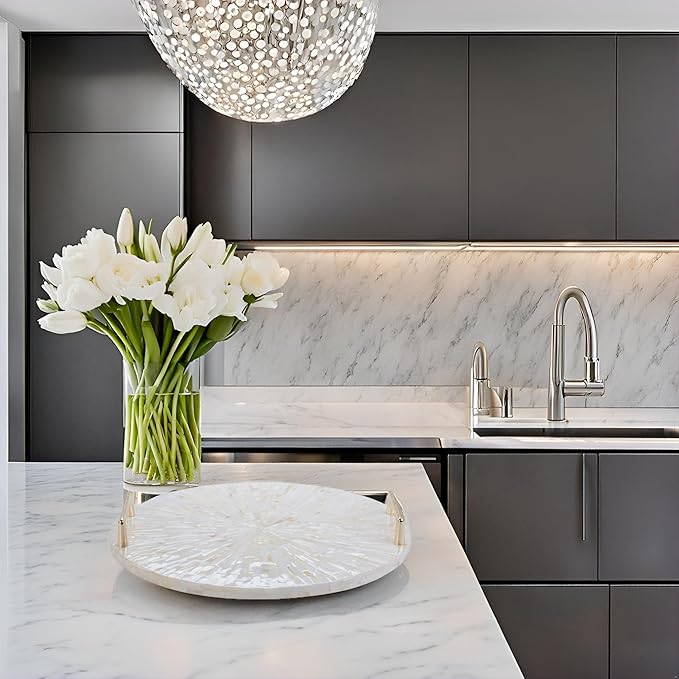 PEMAR Mother of Pearl Decorative Tray, 13" Round Display & Serving Tray with Gold Handles, Vanity/Perfume/Trinket Catchall for Dresser, Bathroom, Vanity Table (White Cream Sunlight Starburst Pattern)