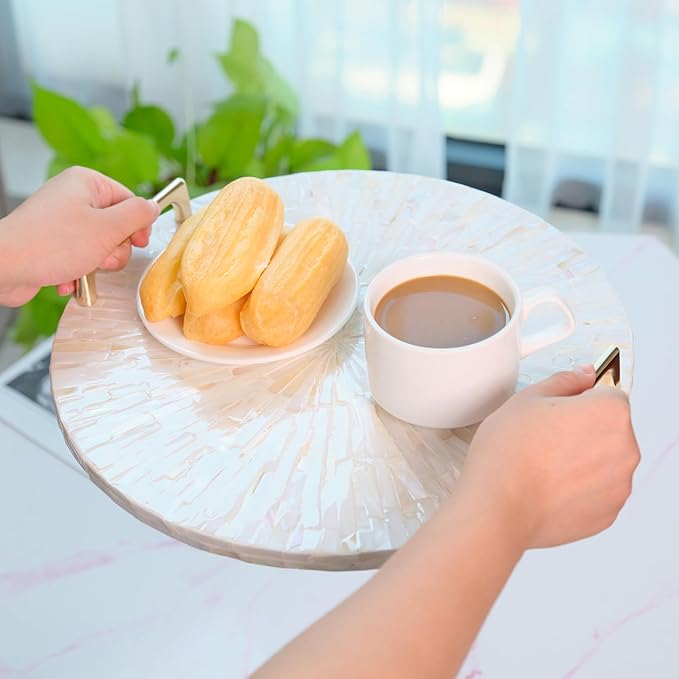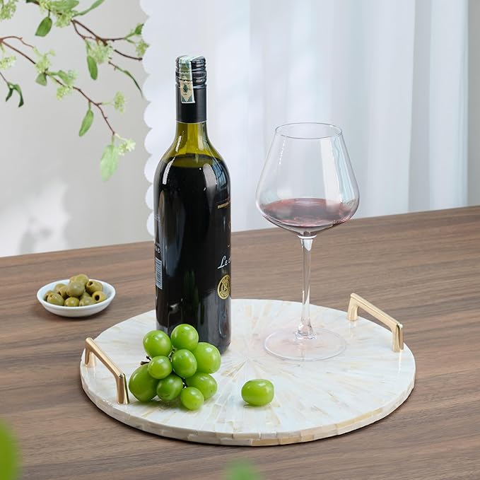 - DECORATIVE TRAY: A 13-inch patterned round tray made of wood, inlaid with mother of pearl with gold handles, perfect for displaying perfumes, jewelry, or catching small items.