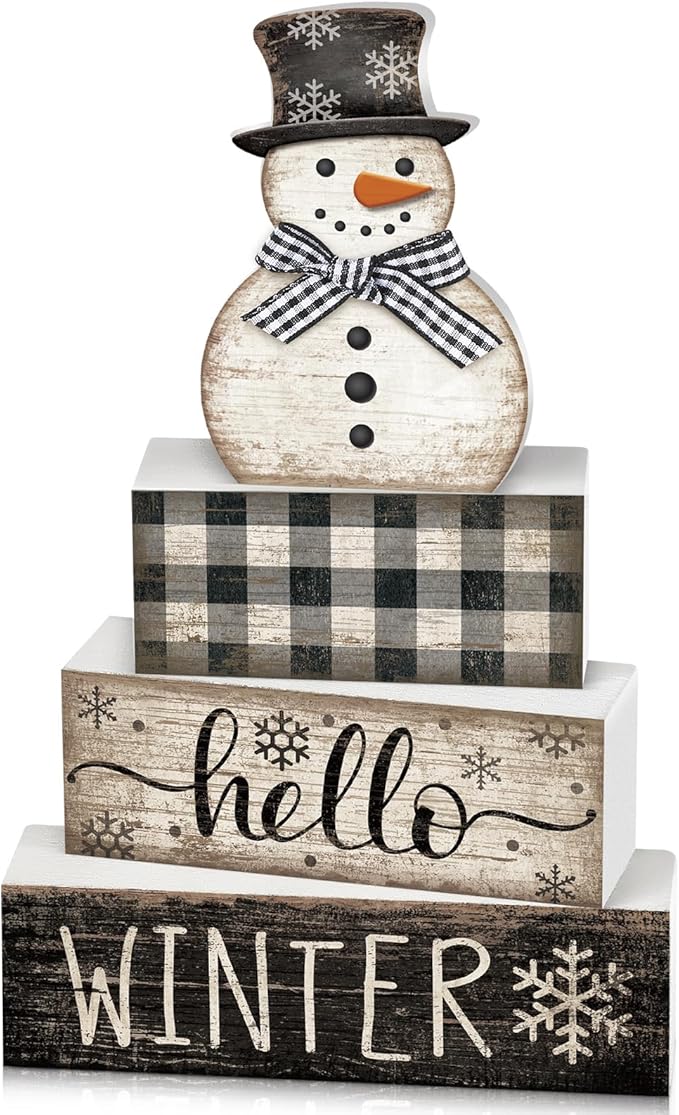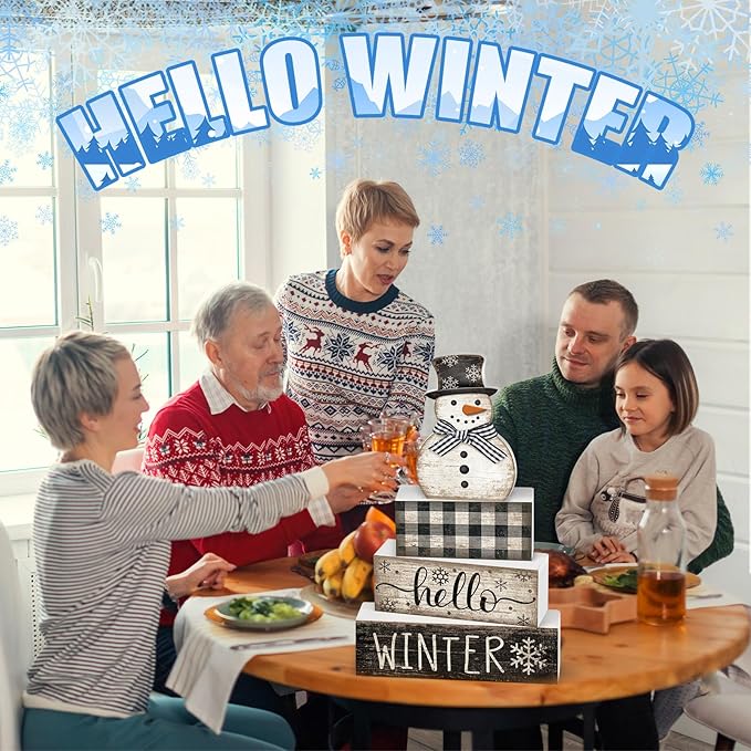 - Winter Snowman Tiered Tray Decorations: winter tiered tray decor set is designed in the shape of a classic snowman sign and books, come with 4 wooden signs, 1 snowman sign and 3 wood decoration books; Vibrant winter centerpieces are suitable for winter parties and home to welcome the holiday