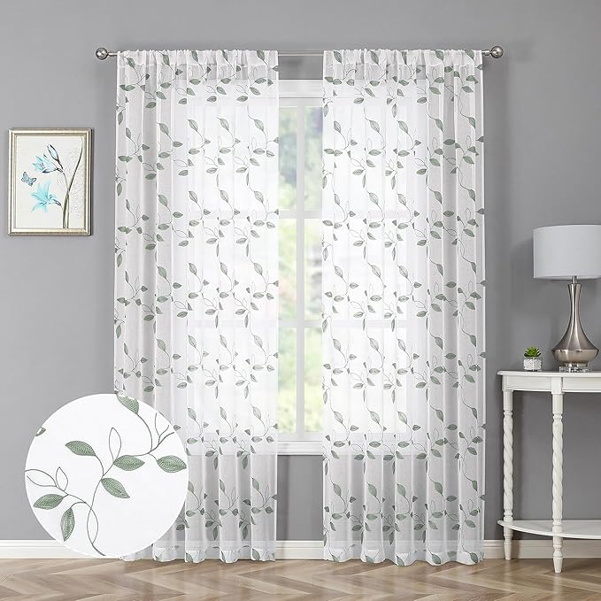 Tollpiz Sage Green Leaf Sheer Curtains Leaves Embroidered Bedroom Curtain Rod Pocket Voile Window Treatment for Living Room, 54 x 84 inches Long, Set of 2 Panels