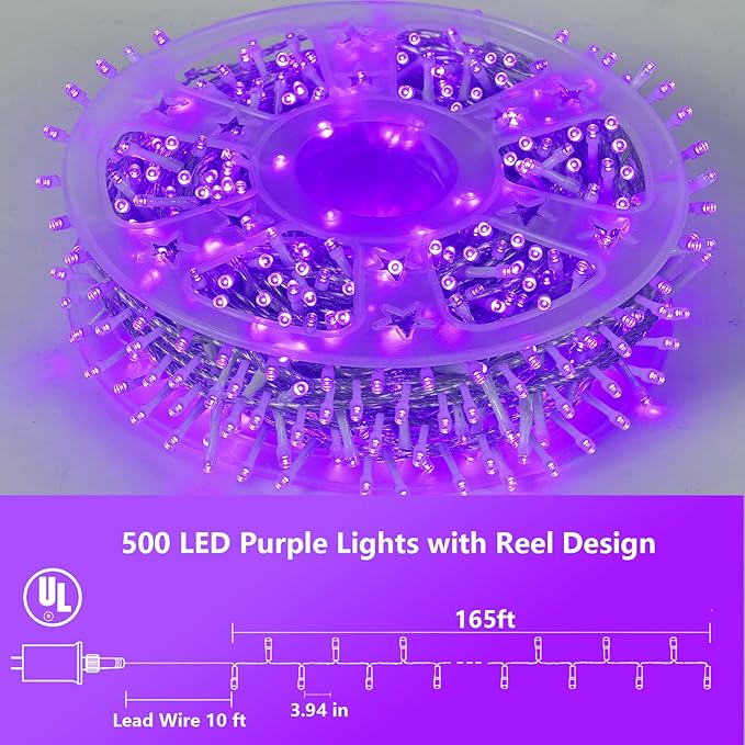 YEGUO 165ft 500 LED Halloween Lights Outdoor Waterproof, Purple String Lights Indoor Plug in, 8 Modes Clear Wire Purple Lights for Halloween Holiday Home Tree Garden Patio Decor