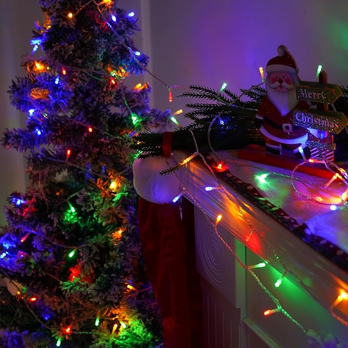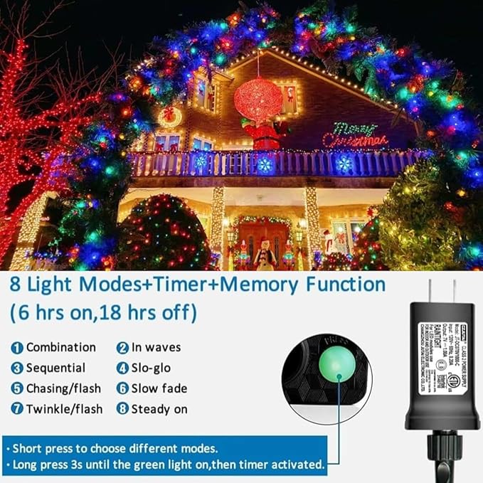 - 8 Lighting Modes: Christmas lights has 8 lighting modes (combination, in wave, sequential, slo-glo, chase/flash, slow fade, twinkle/flash, steady on). Different lighting effects are controlled by the adapter button. Change the mode as needed to attract and surprise your neighbors! Christmas lights will be a eye-catching decoration at your party.