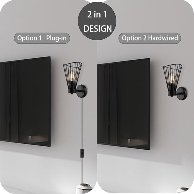 - 【2 in 1 design】 The industrial wall sconce fixtures adopts 2 in 1 installation, you can choose plug-in or hardwire mounting. And you can plug it into the wall outlet, no wiring required. Also you can hardwired mounting, fit US standard junction box.