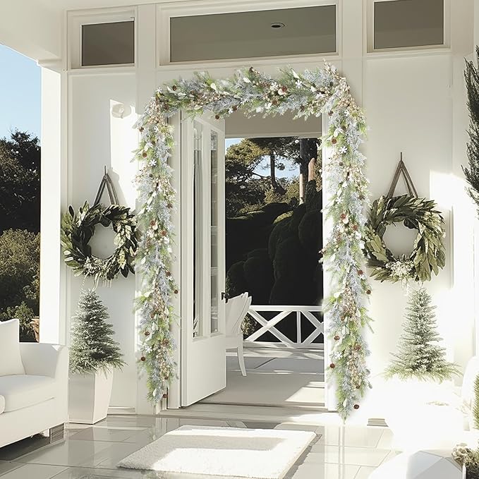 - Christmas Decoration: Capture the magic of nature and welcome the winter season with our flocked norway spruce & pinecone shimmer berries garland. Make the perfect hoilday accent with realistic spruce combined with timeless Christmas elements.
