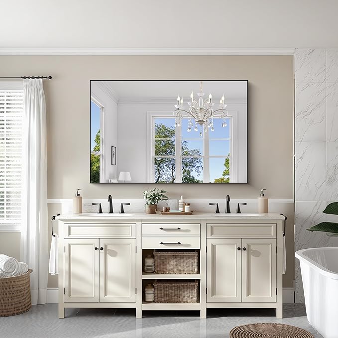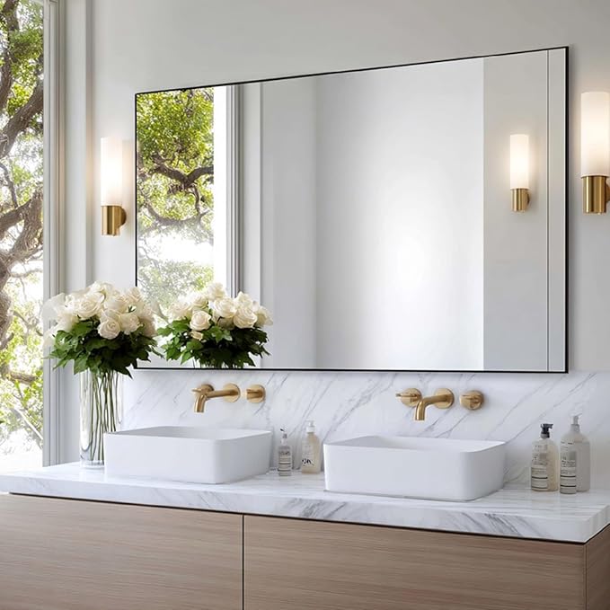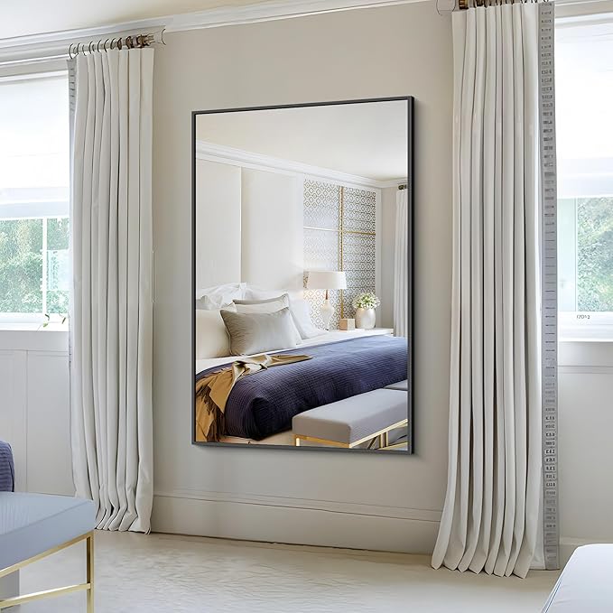 - MODERN DESIGN : KOCUUY 36x55 black vanity mirror is with innovative design which gives the wall mirror a more fashion feel. With a classic square corner, the wall mounted mirror allows for creativity and functionality in bathroom, bedroom, entryway and anywhere else. Let your living space be an expression of your personal style, not limited to modern or contemporary, farmhouse or industrial