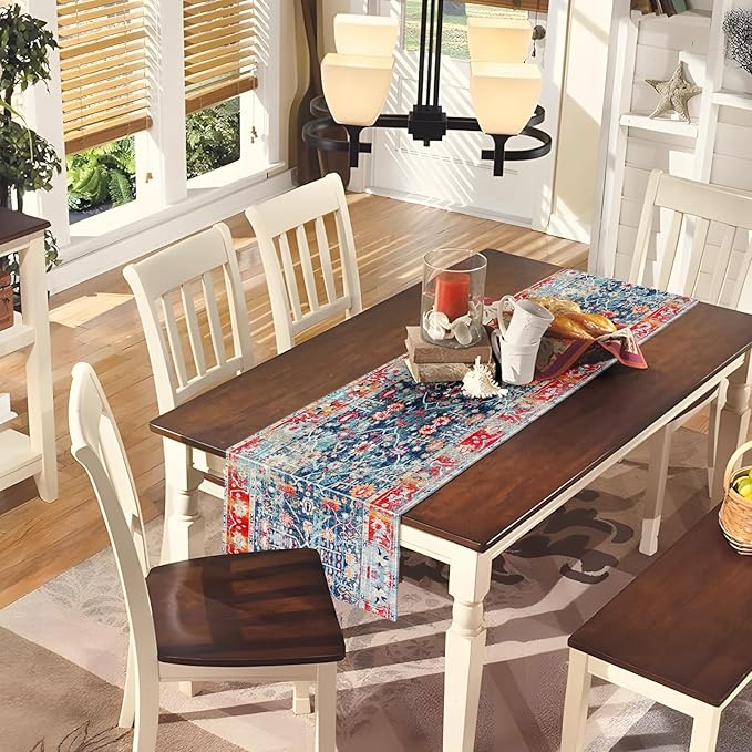 Snycler Table Runner Boho Table Runners Vintage Elegant Farmhouse Table Center Linen Decor for Home Dining Party Entrance (13x108 Inch) Boho-Blue&Red