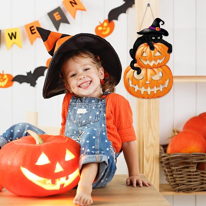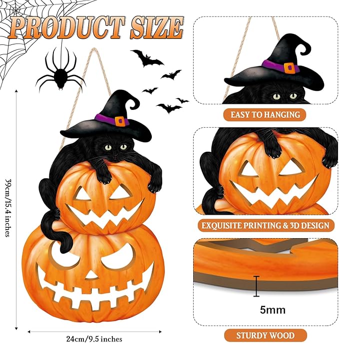 - Unique Halloween Wreath - The Halloween sign uses a cute and spooky Halloween element design of a black cat grovel on a pumpkin for Halloween.The cute Halloween door hanger is uniquely and creatively designed, which is amazing.