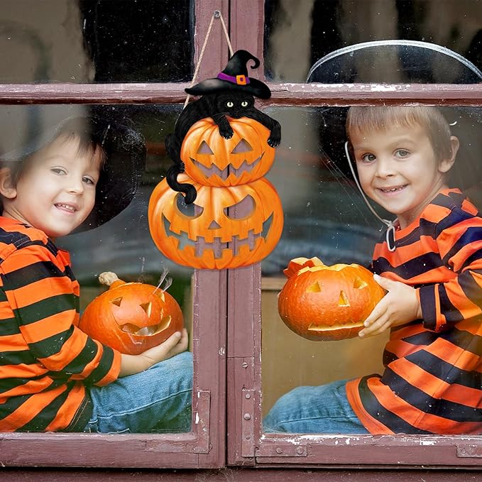 - Wide Applicability - The Halloween black cat hanging sign decor is perfect for Halloween party supplies and haunted house decoration.It can be hung on the front door, wall, shelf, window or porch, you can also hang it to decorate your bedroom, living room, kitchen, garden or yard to create a strong festive atmosphere.