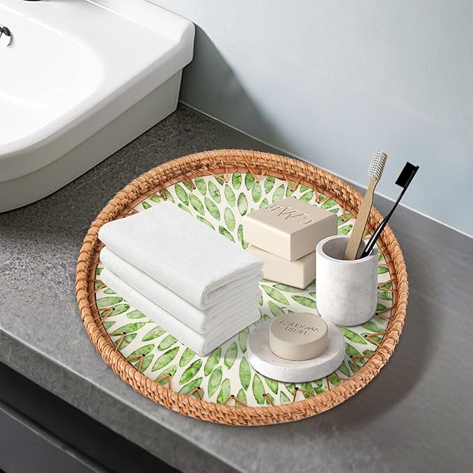 - Boho-Chic Design & Included Coaster: The Bohemian-inspired rattan tray, adorned with pearl inlays at the bottom, is paired with matching rattan coasters to elevate your home decor. This round wicker tray effortlessly blends with farmhouse, coastal, or modern interiors.
