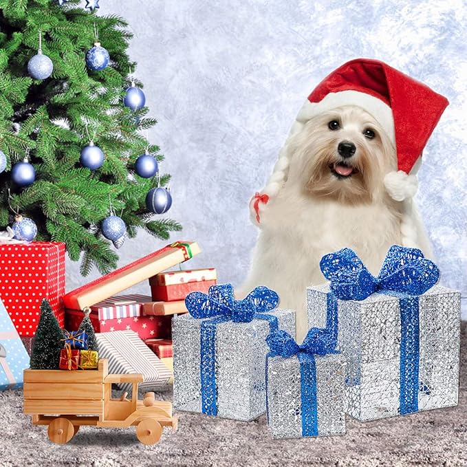 Sunnyglade 7.5”-5.9”-4.7” Set of 3 Christmas Lighted Gift Boxes with Plug for Christmas Decor, Weddings Yard Home Holiday Art Decorations (Silver)