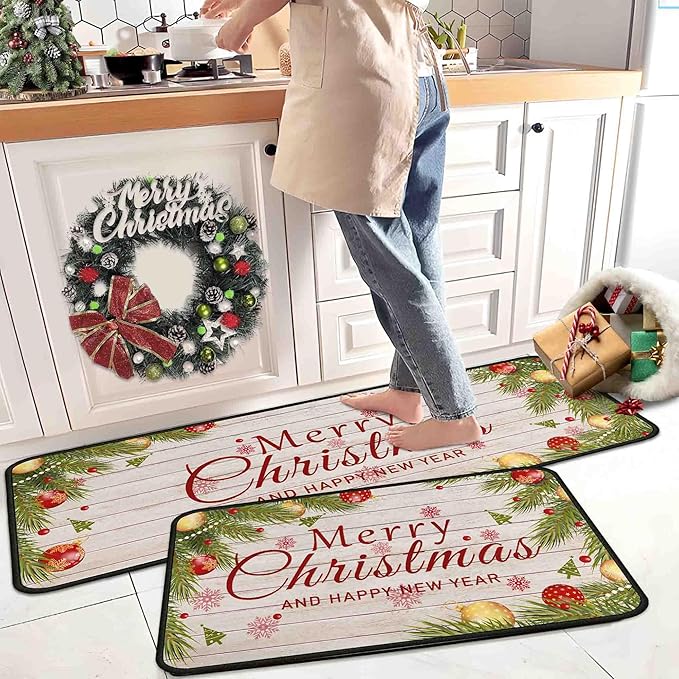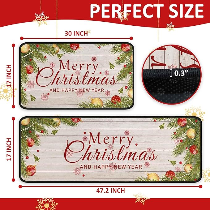 Merry Christmas Kitchen Rugs and Mats Set, Xmas Indoor Floor Mats for Winter, Merry Christmas (17"x47" + 17"x30")