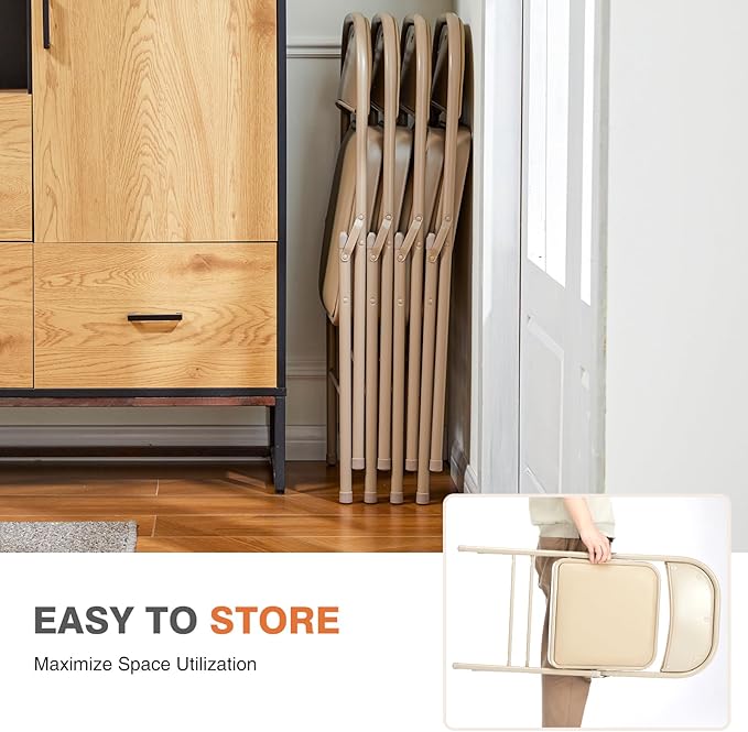 Sweetcrispy Folding Chair 8 Pack, Leather Padded Folding Chairs, Sturdy Metal Foldable Chairs, Easy to Use and Store, Outdoor and Indoor, for Home, Office, Party, Comfy, Kahki