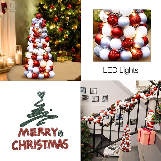 Amooca 16in Christmas Ball Tree with LED Lights Table Centerpiece Fireplace Decor Indoor Holiday Party Home Decoration Red White Silver