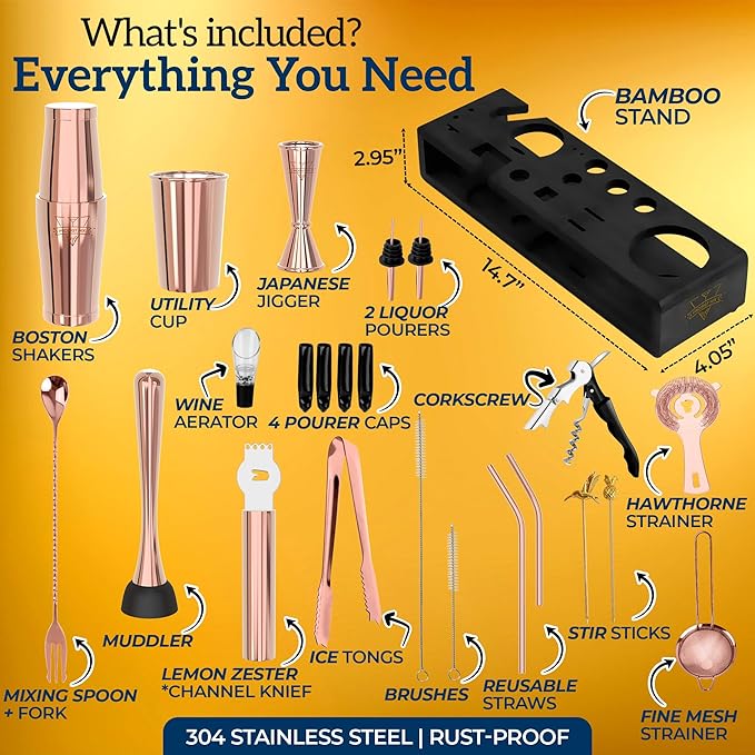 - ✔ EVERYTHING YOU NEED – Elevate your home bar with our 20-piece shaker set bartender kit, no need to purchase more bartender accessories. Make delicious cocktails with confidence, whether you're new to bartending or a seasoned mixologist.