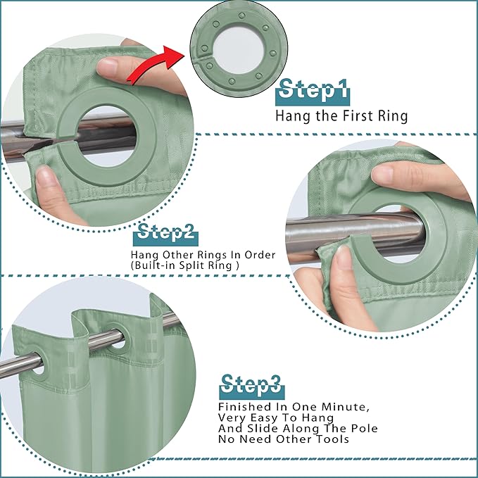 - SUPER EASY TO INSTALL : This shower curtains design with High Quality Flex On Rings that you can very easy to install it in one minute.Smart design will made it easier to hang and to slide along the pole.