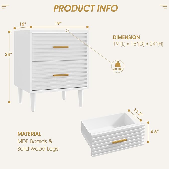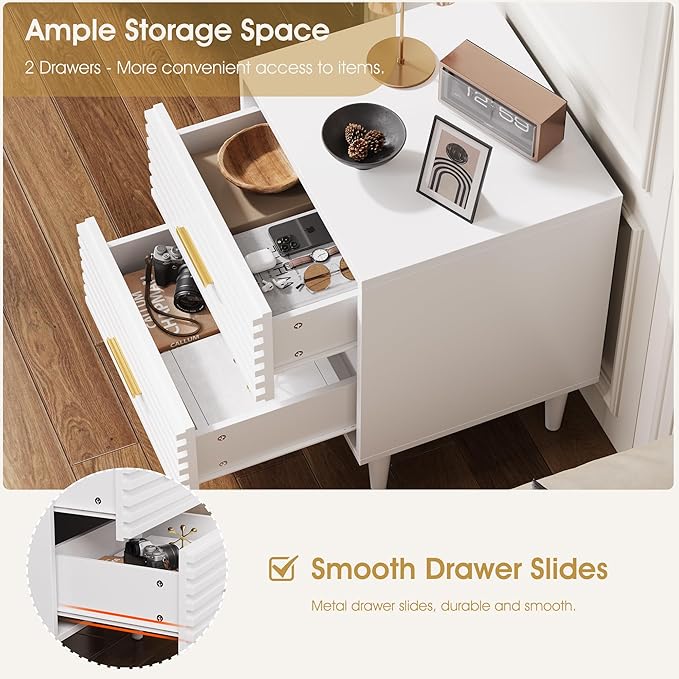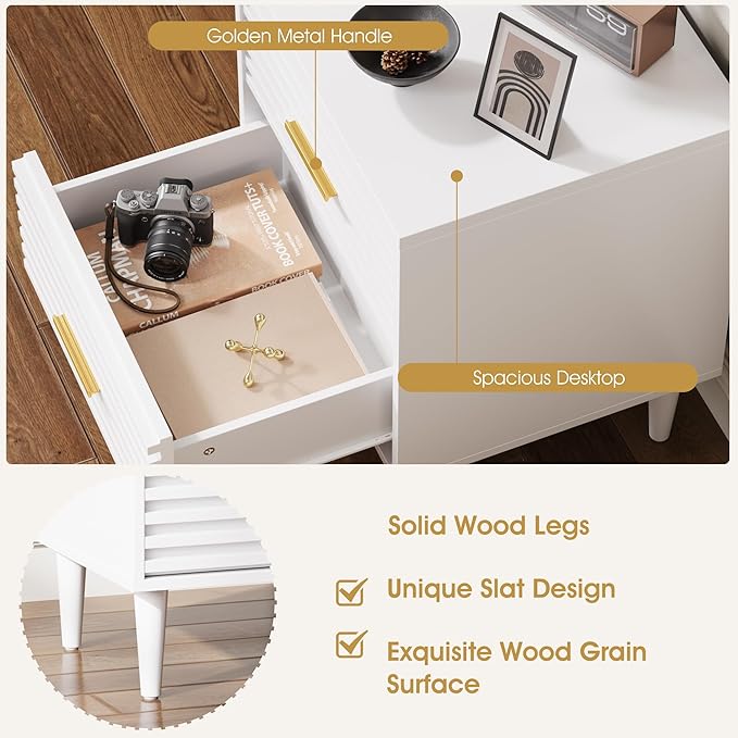 Alohappy Nightstands Set of 2, Mid Century Modern Night Stands, Fluted Bedside Tables for Bedroom, End Tables with Storage Drawers, Vintage Bed Side Table Wood Accent Table for Living Room, White 2pc