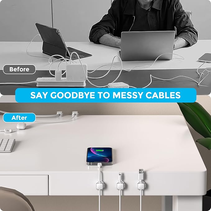 - NO-RESIDUE: Utilizes the acrylic adhesive that allows the cable organizer to stick firmly to any flat surface, such as wooden tables, glass, or ceramic tiles, etc Meanwhile removable adhesive won't damage your desktop, wall, no residue left after removal