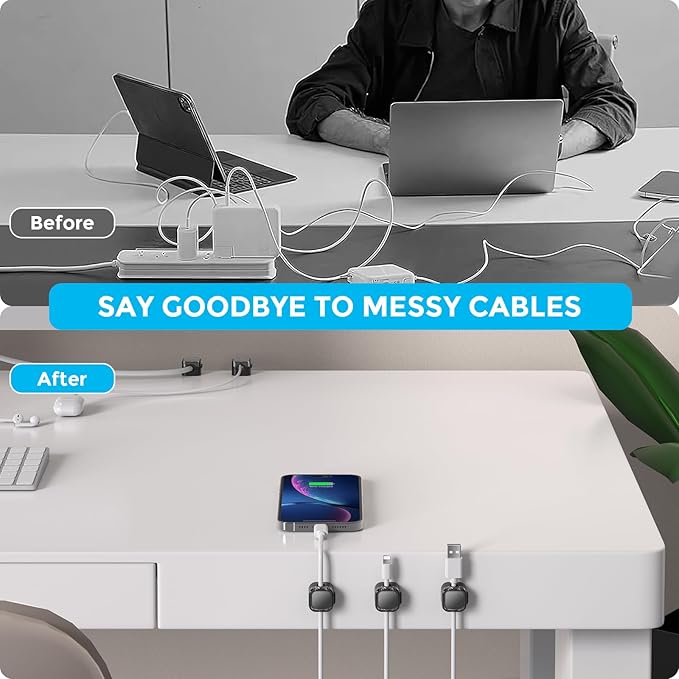- NO-RESIDUE: Utilizes the acrylic adhesive that allows the cable organizer to stick firmly to any flat surface, such as wooden tables, glass, or ceramic tiles, etc Meanwhile removable adhesive won't damage your desktop, wall, no residue left after removal