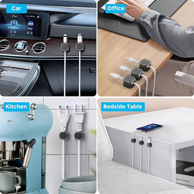 - UPGRADED MAGNETIC CORD HOLDER: Feature an innovative magnetic open-close mechanism, combine with the unique design of the sophisticated 60° rotating shaft and magnetic locking cord. This cord holder organizer allow you to place and remove your phone charging cords, HDMI cords, household wires qucikly and securely with just one hand