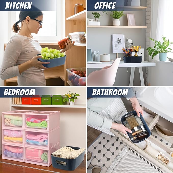 - Practical Handle Design: the hollow handles on each side of the blue plastic bins are comfortable to hold, with smooth brims and no excess burr to hurt your hands, making it easy for you to hold the basket, while the basket is at a height where you can use the side protrusion to easily pull out or push back the basket, which can give you a big favor in daily life