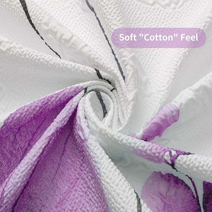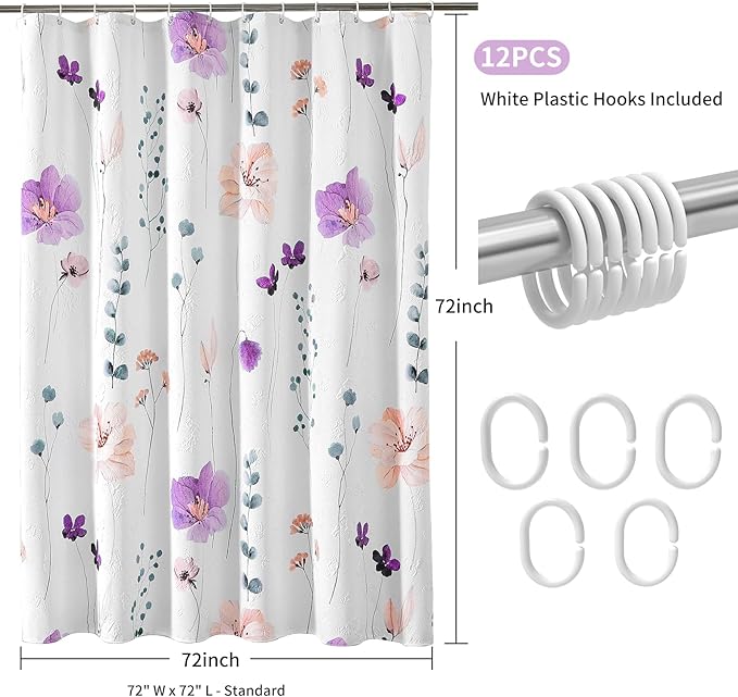 QIYI Watercolor Floral Shower Curtain, 3D Embossed Butterflies Purple Pink Flower Bathroom Curtain, Minimalist White Cloth Bath Curtains, Waterproof Fabric Texture Shower Curtain Set with Hooks, 72x72