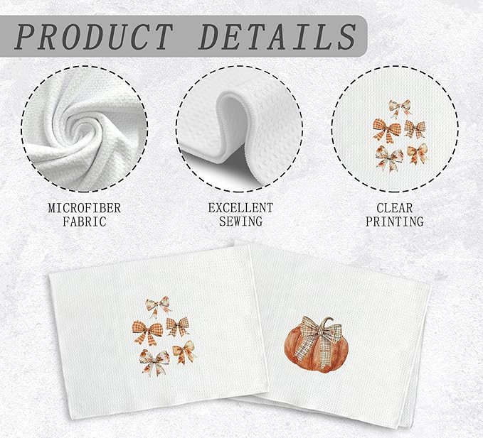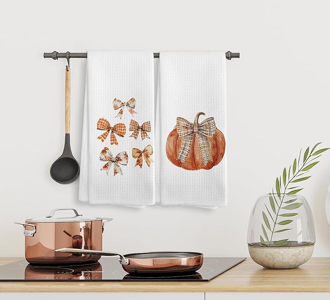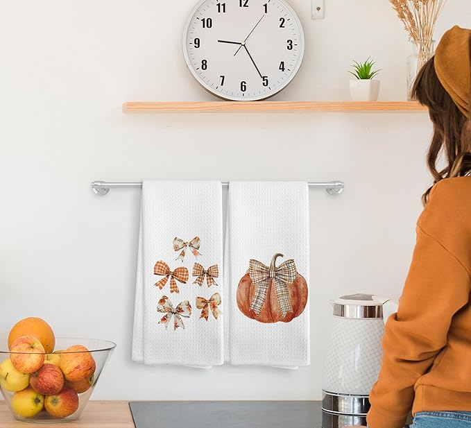Fall Bow Kitchen Towels and Dishcloths Set of 2, Pumpkin Decor, Bathroom Hand Towels, Preppy Drying Cloth for Girls Dorm Kitchen, 1624Inch