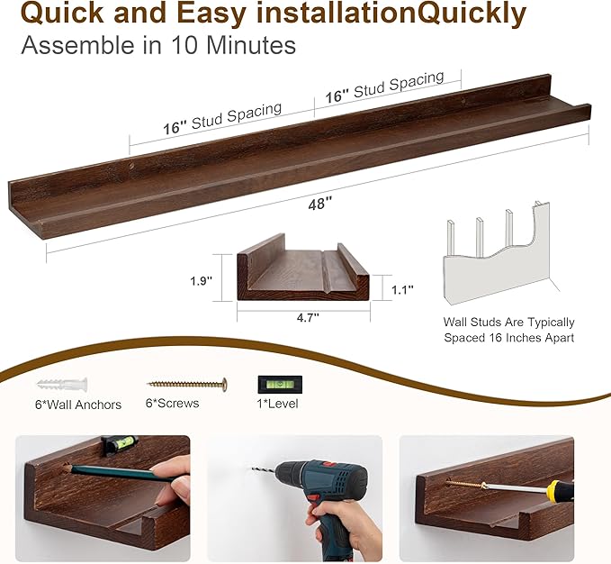 Floating Picture Ledge Shelves 48 Inch Solid Oak Wood Set of 2, Rustic Wall Storage Shelves with Lip, Kids Bookshelf, Photo & Picture Ledge Shelves for Bedroom, Living Room, Kitchen
