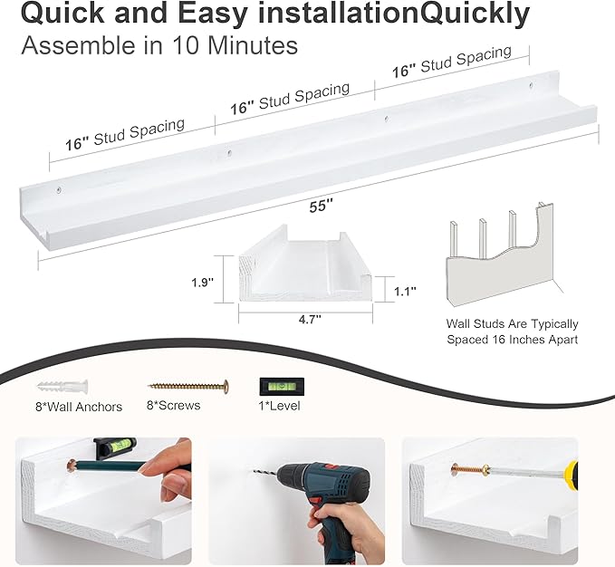 - Picture Wall Collage Decor: If you have dozens of pictures but don't know how to display them, FLYJOE picture ledge shelves(especially large size) for wall are perfect for you! With our hanging shelves, store and display different types and size of photo frames in one place with no worries of falling off.