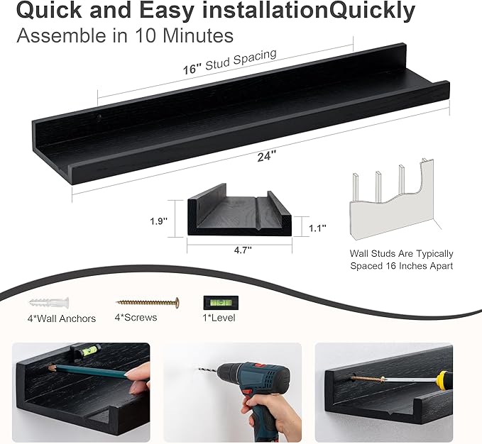• Easy Installation: Each shelf comes with all necessary hardware and clear instructions for hassle-free mounting. The floating design creates a sleek, seamless look, adding sophistication to your space.