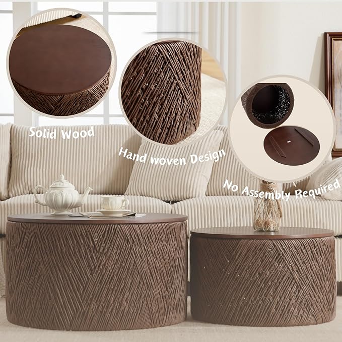 - [Elegant Design]: This nesting coffee tables set includes two round nesting tables with a sense of space and hierarchy and wood finish, featuring a sophisticated hand woven design that adds a touch of rustic charm to any living space