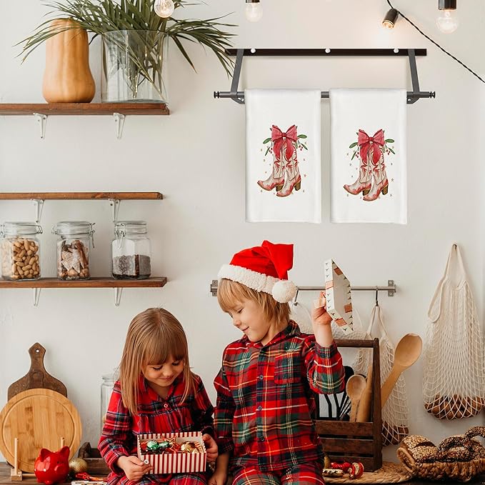 Western Christmas Kitchen Towels, Christmas Coquette Red Bow Cowgirl Boots Decorative Hand Towels for Bathroom, Christmas Dish Towels for Kitchen, Western Christmas Kitchen Bathroom Decor, 16x24 Inch