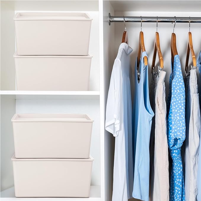 Menkxi 4 Pcs Storage Bins with Lids Plastic Containers Stackable Storage Box Baskets for Organizing Shelves(Beige,Large)