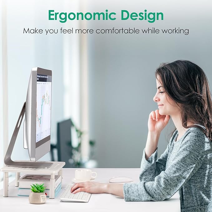 - Ergonomic Height Adjustable: This monitor stand features an ergonomic design, offering three height settings at 3.9 inches, 4.7 inches, and 5.5 inches. Achieve your preferred and comfortable viewing height by simply pressing the buttons on the legs to customize the stand's elevation