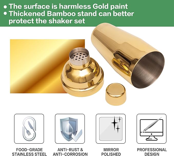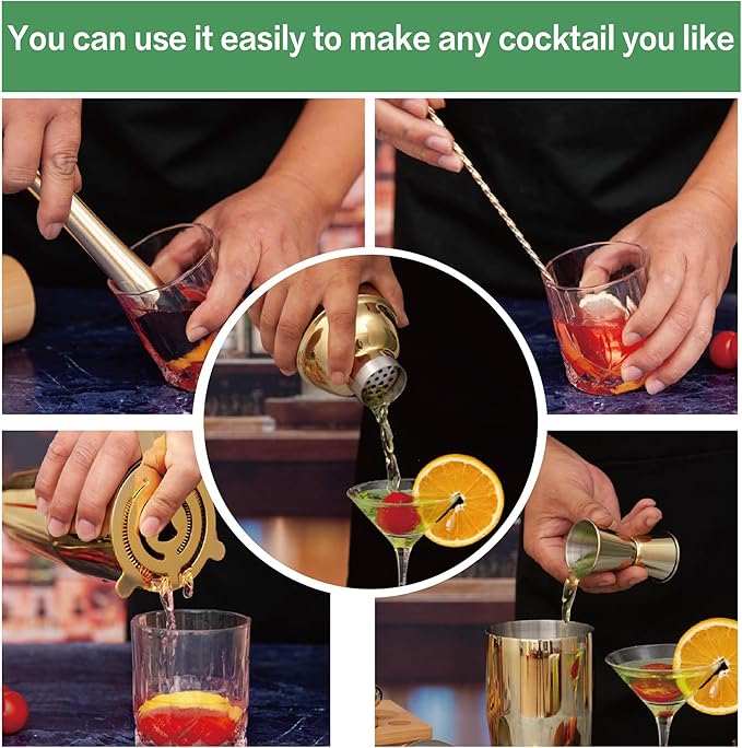 - Professional Bar Set:The shaker set includes a 25oz martini stainless steel shaker,Strainer, 10-inch bar mixing spoon, a double size 0.5oz/1oz jigger,muddler,You can easily make any cocktail you like.