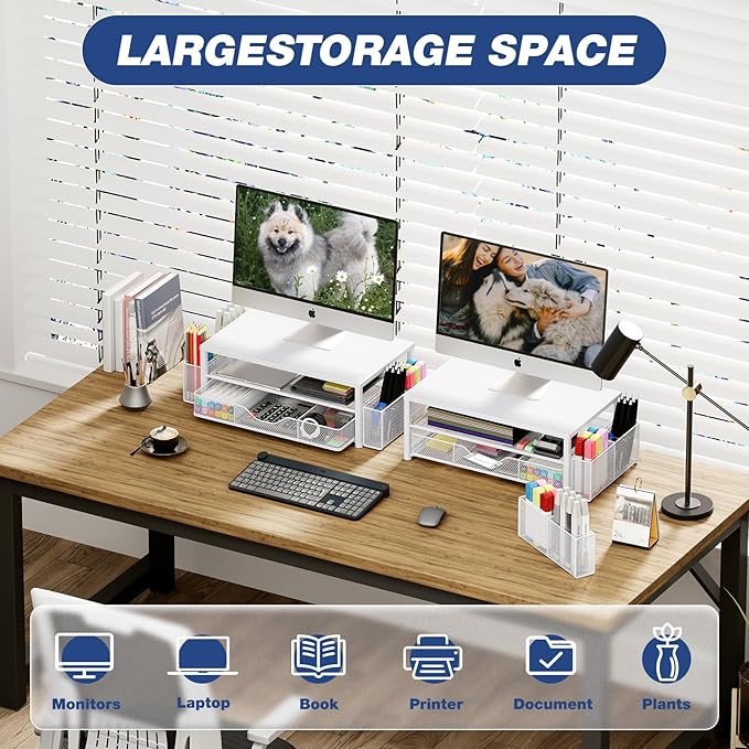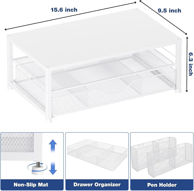 - 【Save Space】:This 2-Tier monitor stand with drawer and 2 hanging pen holders provides ample storage space to keep your office supplies and office desk accessories neatly organized and easily accessible, keeping your workspace tidy and improving your sense of well-being