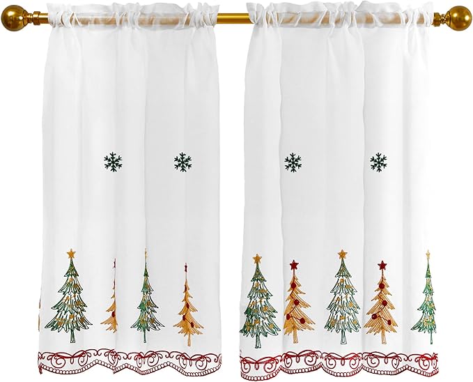 Deconovo Christmas Kitchen Tier Curtains, Embroidered Cafe Tiers, Semi Sheer Window Treatment with Rod Pocket, Light Filtering for Small Windows, Door & Sink Areas, 28W x 30L, Tree, 2 Panels