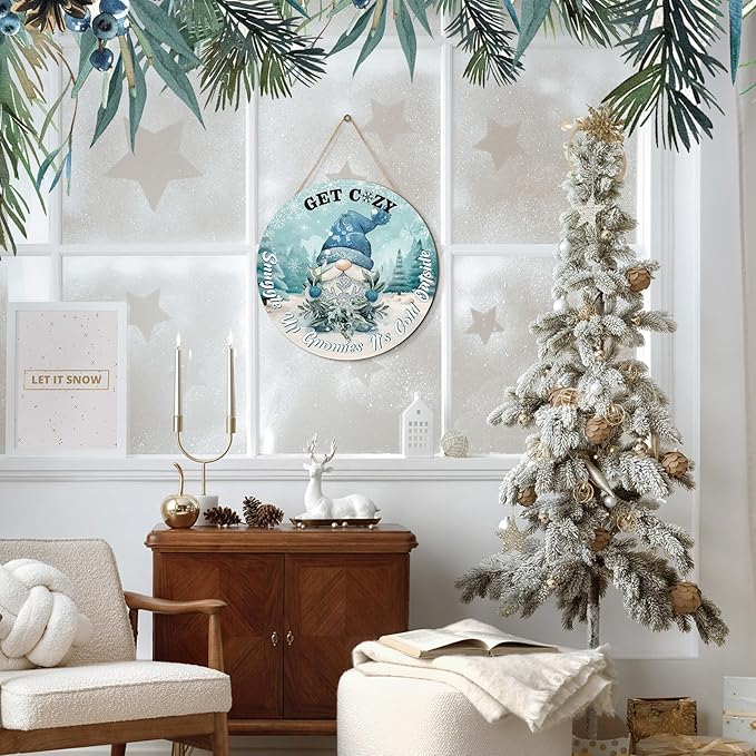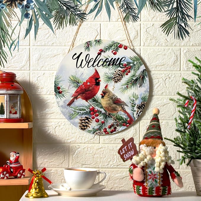 3 Pcs Winter Welcome Sign for Front Door Decor Winter Farmhouse Cardinal Bird Gnome Wooden Door Hanger for Outdoor Outside Porch Round Hanging Signs for Home Indoor Outdoor Decorations