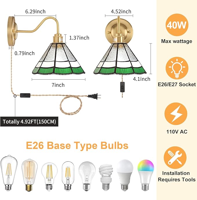- 【High Quality】This wall lamp uses stained glass for the shade, which offers better light transmission, high temperature resistance and a longer service life than those plastic shades, each of which showcases meticulous attention to detail and an intrinsic interest in nature. In addition, the coloured glass offers neutral colours and casts a soft light, a soft glow that will illuminate them for a warm visual enjoyment.