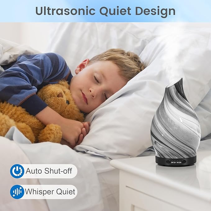 - NOTE: POWER ADAPTER IS PLACED INSIDE WATER TANK. Elegant Design: Handcrafted glass exterior with wave patterns in classic gray and white. This glass diffuser perfectly aligns with simple, minimalistic, modern and contemporary decor styles. Our air diffuser is not just functional but also an exquisite decor for shelves, tables, or desks in homes, offices studios or spa rooms, adding a decorative touch and delightful scent.